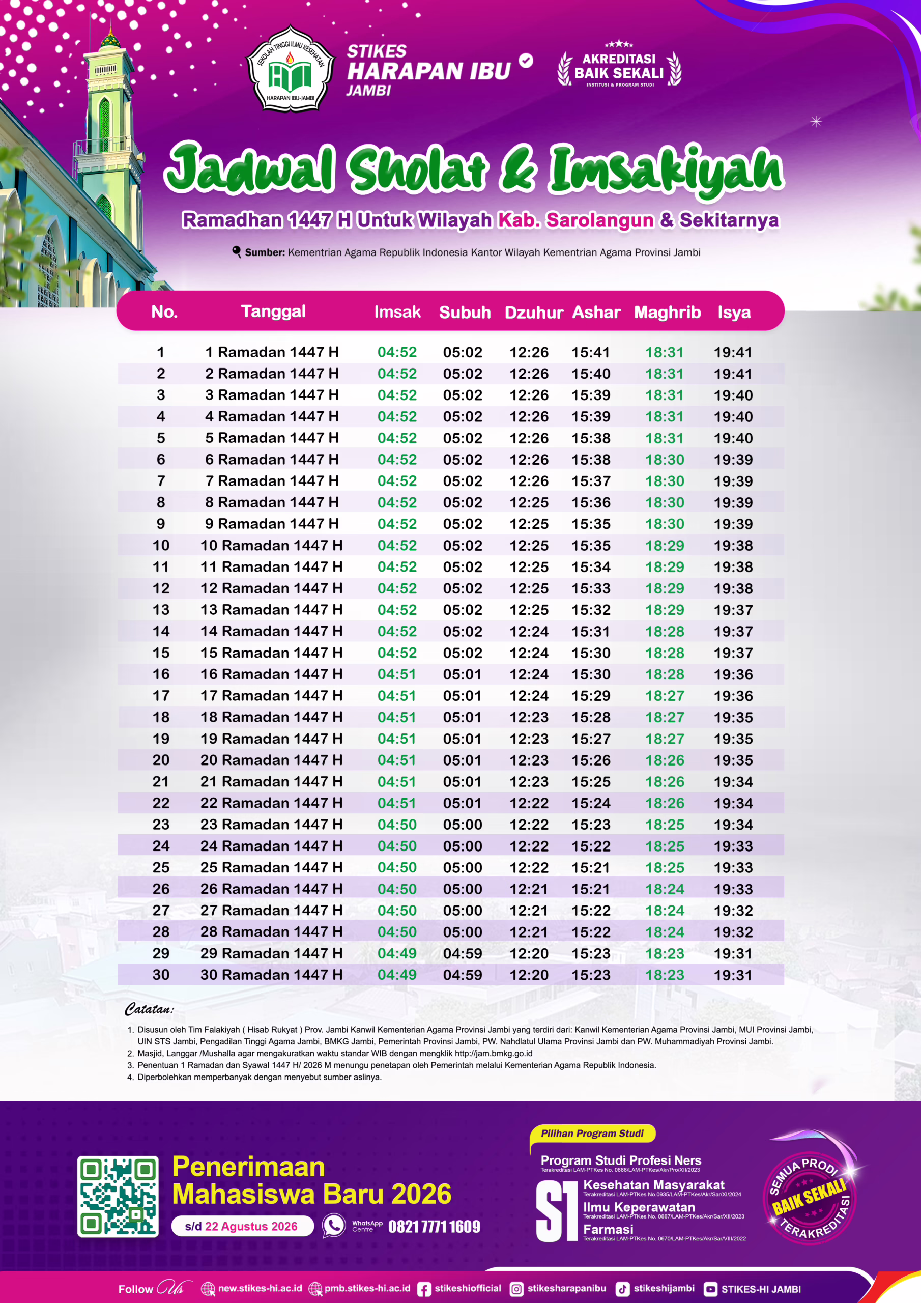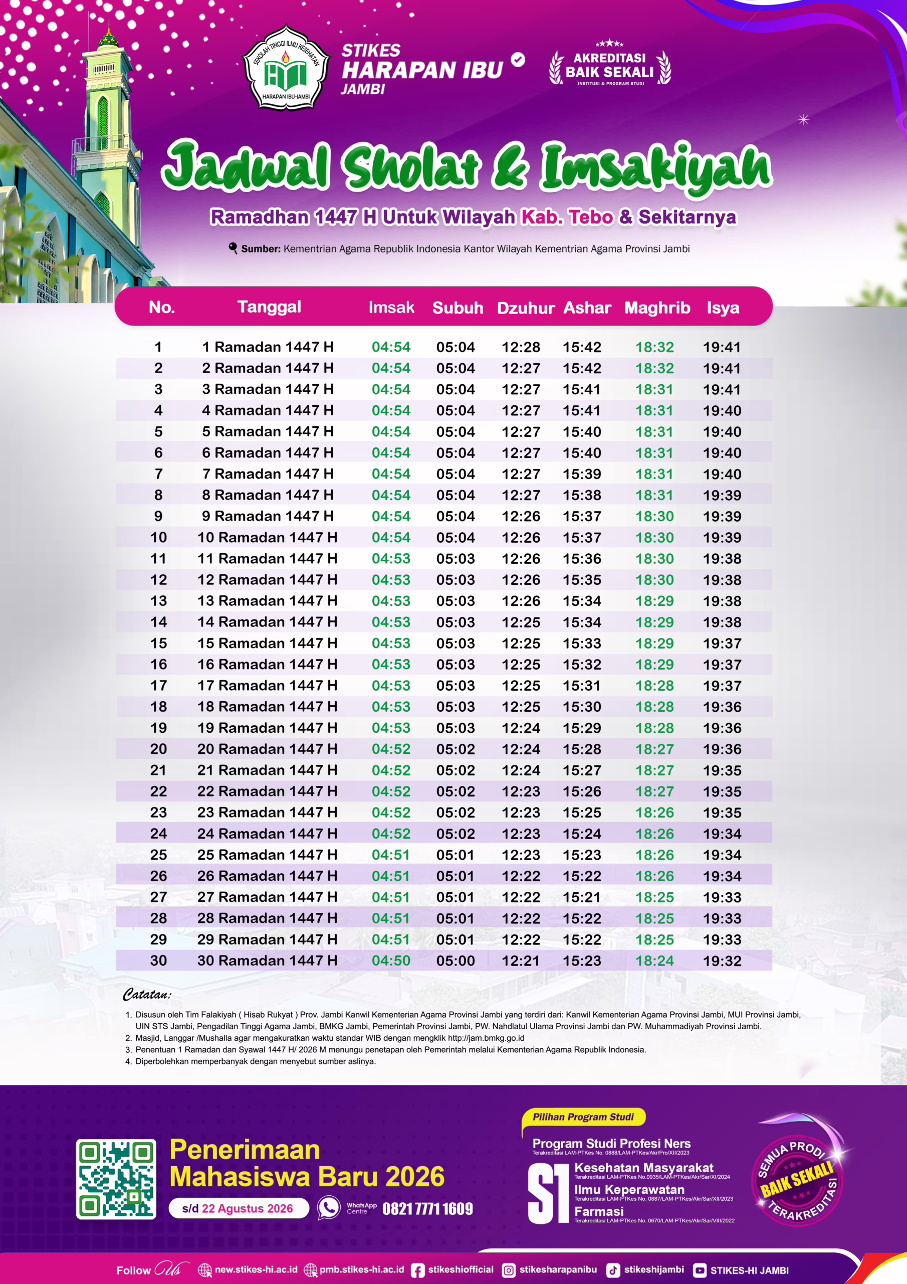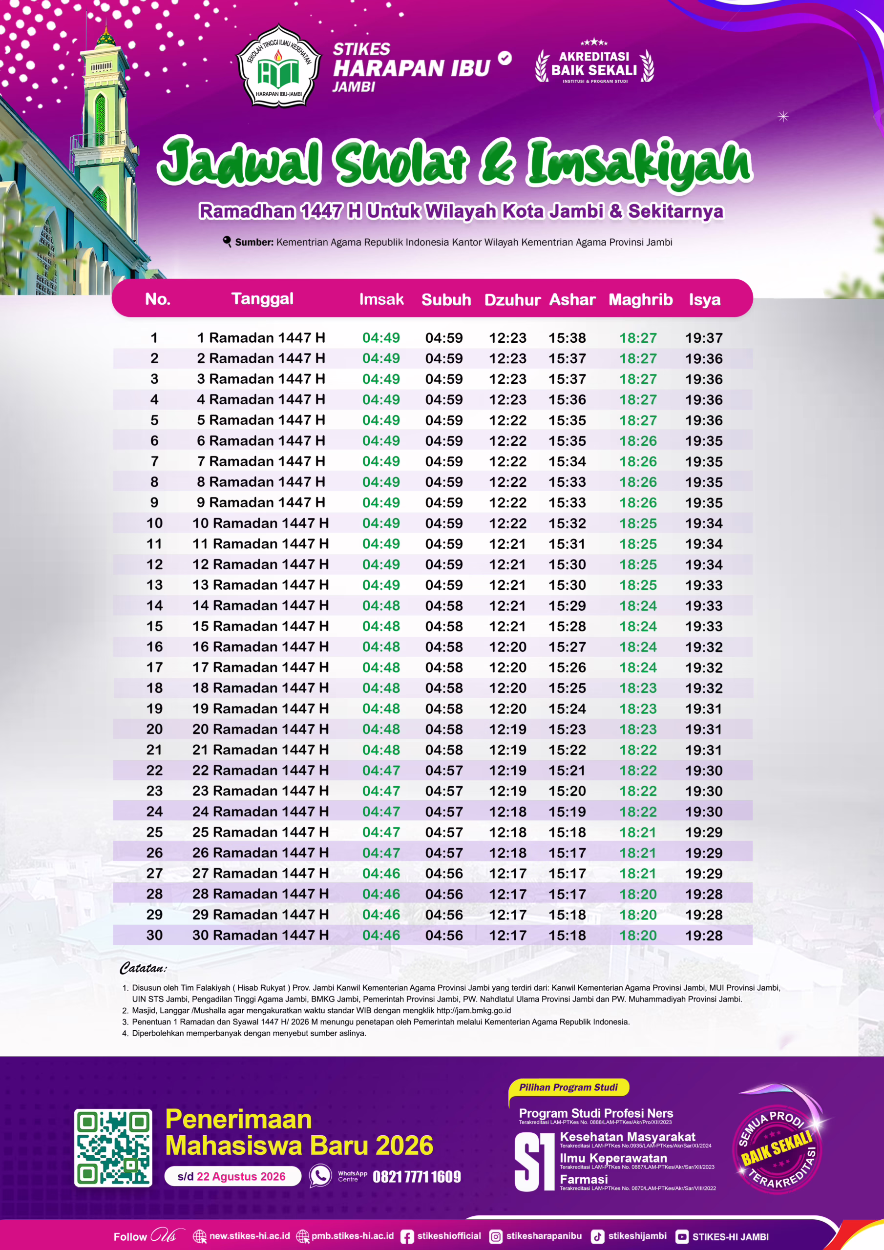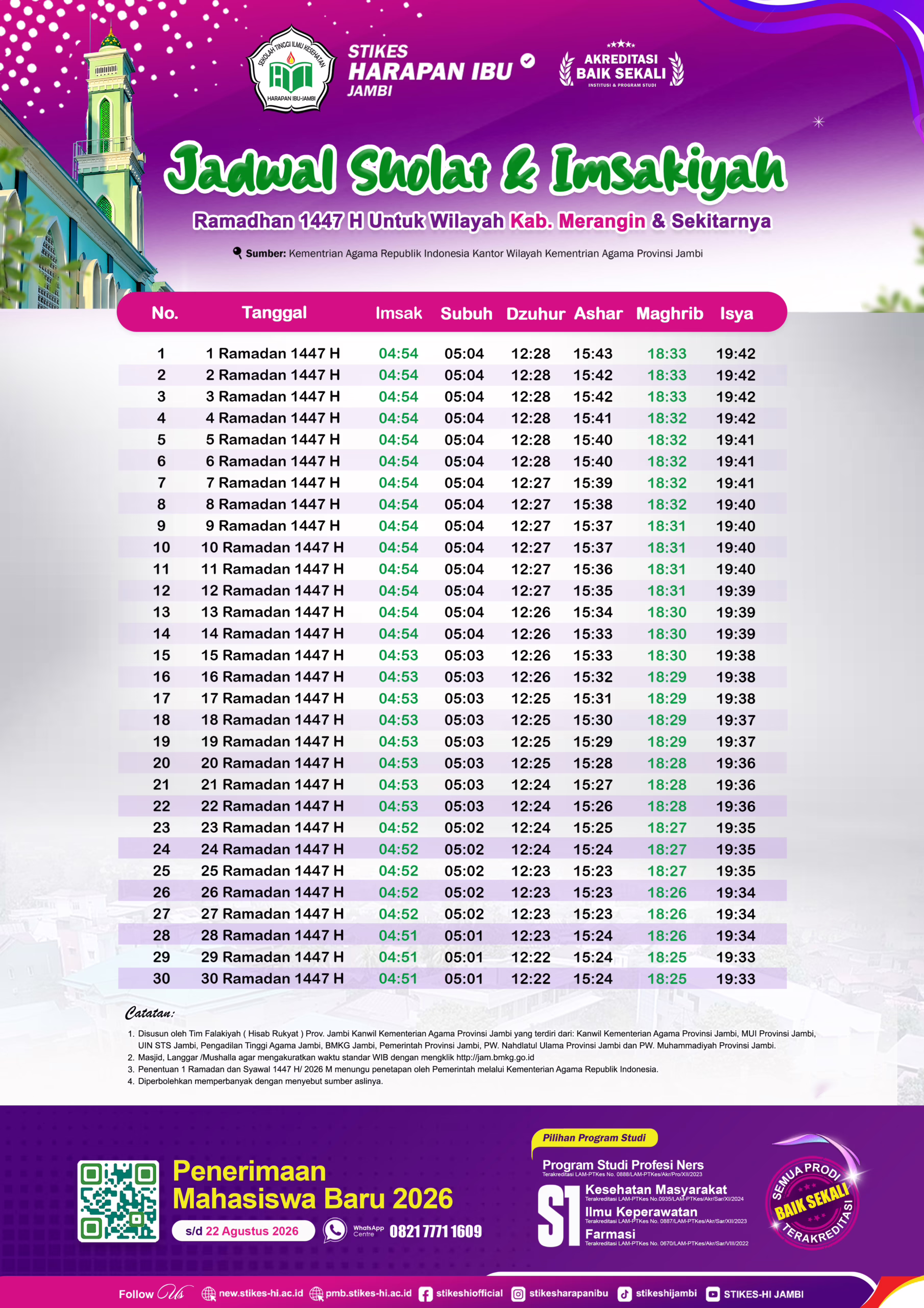 Hadirnya bulan suci Ramadhan 1447 H tinggal menghitung hari. Berbagai persiapan digelar menyambut bulan yang penuh keberkahan ini. STIKES Harapan Ibu Jambi menyediakan jadwal imsakiyah untuk masyarakat Provinsi Jambi.